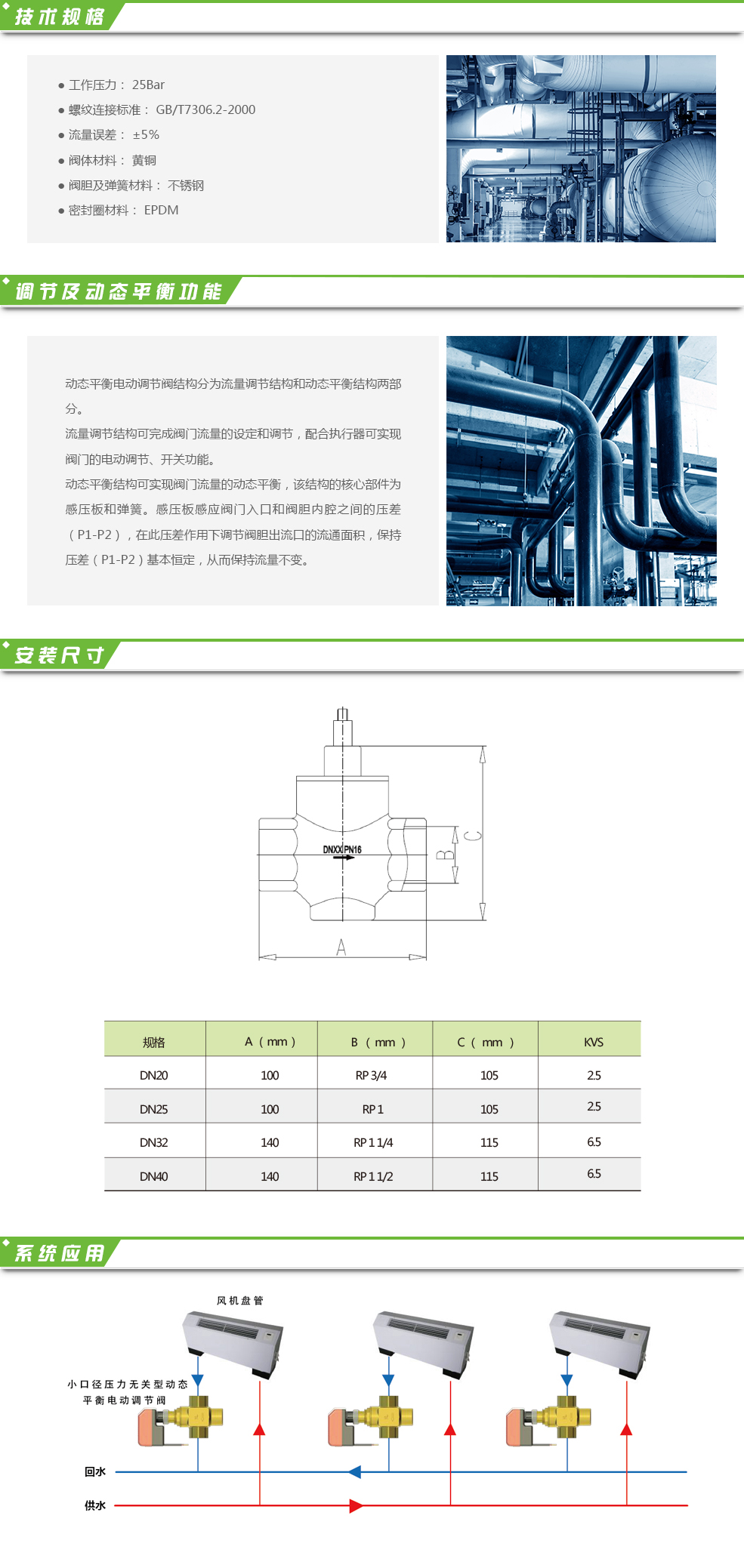 本系列產(chǎn)品集動態(tài)平衡與調(diào)節(jié)功能于一體,根據(jù)流量需求調(diào)整好閥門開度,無論系統(tǒng)壓差如何波動,只要在閥門的工作范圍內(nèi),閥芯即可自動調(diào)整可變流道開度,保持流量恒定不變。該閥門采用新穎獨(dú)特的剛性結(jié)構(gòu),徹底克服老舊膜片式閥門的壽命短、調(diào)節(jié)范圍小等缺點(diǎn)。精確校準(zhǔn)的閥芯可確保恒定在±5%的偏差范圍內(nèi)。通過動態(tài)平衡功能動態(tài)平衡系統(tǒng)的阻力,保證設(shè)備輸送介質(zhì)流量在一定壓差范圍內(nèi)不受系統(tǒng)壓力波動影響,保持恒定。根據(jù)設(shè)備的輸入信號,執(zhí)行器改變閥門開度,實現(xiàn)閥門的調(diào)節(jié)和開關(guān)功能。