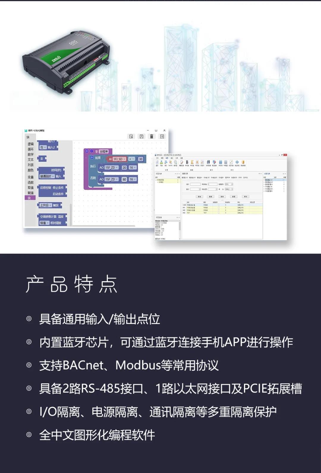 HE系列DDC控制器支持多種協(xié)議及總線, 帶通用輸入、輸出接口, 可自由編程、靈活擴展。適用于冷水機組、熱泵機組、空氣處理機組、送/排風機、精密空調(diào)、區(qū)域能源站、照明和給排水等應(yīng)用場景。