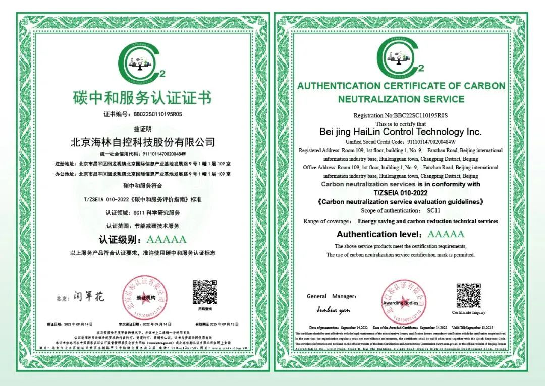 經(jīng)過(guò)我司不斷完善、不懈努力,已成功領(lǐng)取“碳中和用戶服務(wù)AAAAA級(jí)認(rèn)證證書(shū)”,碳中和服務(wù)認(rèn)證分為五個(gè)等級(jí),即A、AA、AAA、AAAA、AAAAA級(jí),等級(jí)越高說(shuō)明企業(yè)綜合實(shí)力和服務(wù)水平越高。此次評(píng)審,海林自控榮獲最高級(jí)別碳中和服務(wù)認(rèn)證。
