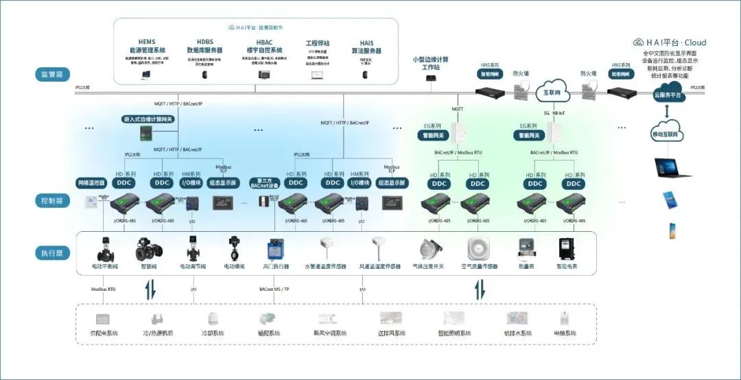 EBA能源樓控系統(tǒng)具體包括Lora無線聯(lián)網(wǎng)計量一體型溫控器、智能網(wǎng)關(guān)、邊緣計算網(wǎng)絡(luò)引擎、IOT-DDC、HAI可視化智慧運營運維運管平臺等明星產(chǎn)品及平臺,智能管控覆蓋暖通空調(diào)機(jī)房冷熱源設(shè)備、水泵等輸配設(shè)備以及室內(nèi)環(huán)境側(cè)風(fēng)機(jī)盤管等空調(diào)設(shè)備。