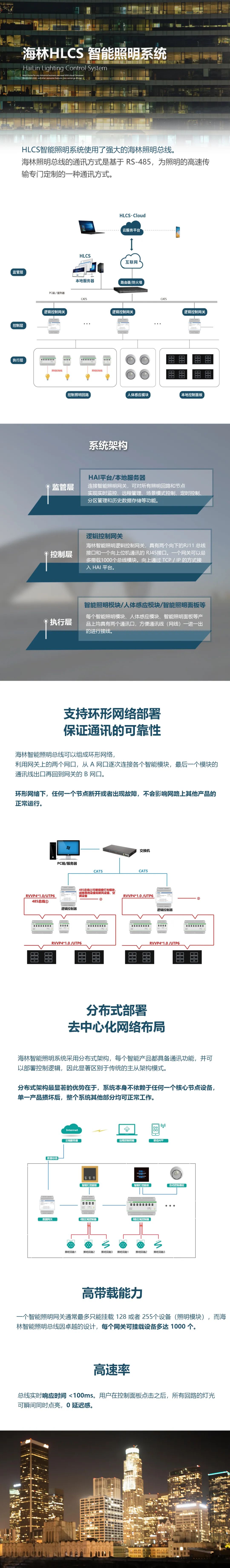 海林智能照明系統(tǒng)因高速率、帶載能力高、穩(wěn)定性強(qiáng)的特點,得到了大多數(shù)在酒店、辦公及住宅項目中的應(yīng)用。尤其是當(dāng)項目的照明系統(tǒng)非常龐大時,對照明控制器的監(jiān)控管理非常繁瑣的情況,海林總線控制、分區(qū)部署的智能照明系統(tǒng)的優(yōu)勢更加明顯。