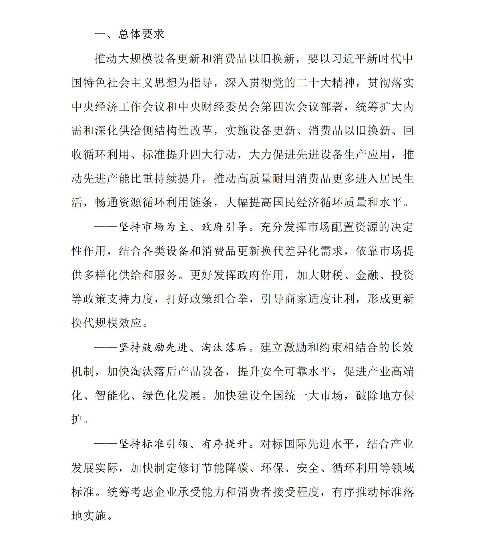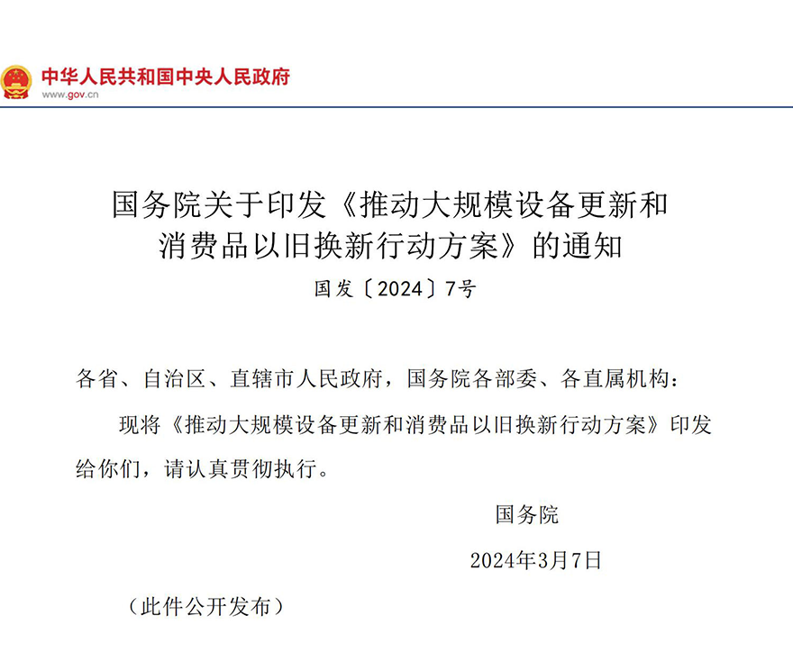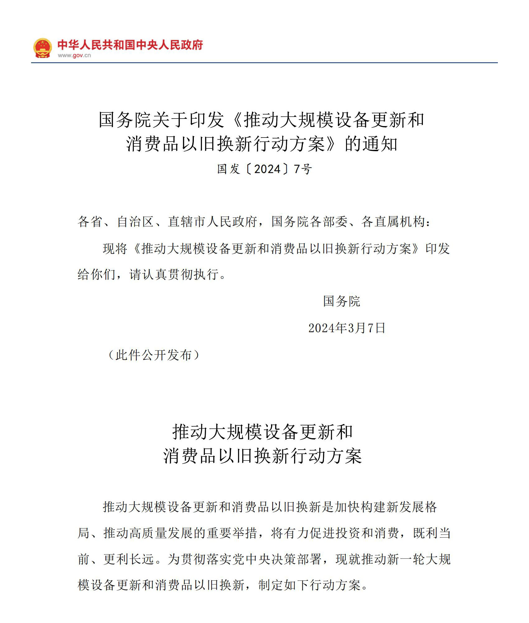 3月13日晚間,國務院正式印發(fā)《推動大規(guī)模設備更新和消費品以舊換新行動方案》。