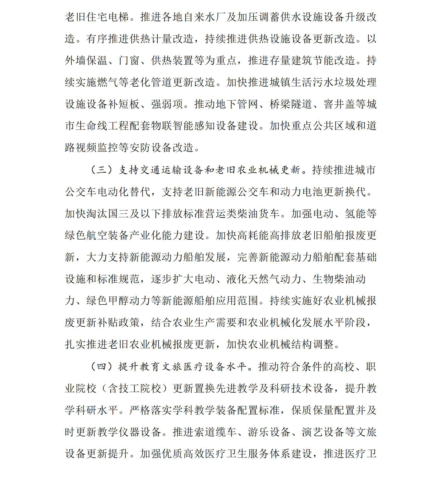 (二)加快建筑和市政基礎設施領域設備更新。圍繞建設新型城鎮(zhèn)化,結(jié)合推進城市更新、老舊小區(qū)改造,以住宅電梯、供水、供熱、供氣、污水處理、環(huán)衛(wèi)、城市生命線工程、安防等為重點,分類推進更新改造。加快更新不符合現(xiàn)行產(chǎn)品標準、安全風險高的老舊住宅電梯。推進各地自來水廠及加壓調(diào)蓄供水設施設備升級改造。有序推進供熱計量改造,持續(xù)推進供熱設施設備更新改造。以外墻保溫、門窗、供熱裝置等為重點,推進存量建筑節(jié)能改造。持續(xù)實施燃氣等老化管道更新改造。加快推進城鎮(zhèn)生活污水垃圾處理設施設備補短板、強弱項。推動地下管網(wǎng)、橋梁隧道、窨井蓋等城市生命線工程配套物聯(lián)智能感知設備建設。加快重點公共區(qū)域和道路視頻監(jiān)控等安防設備改造。