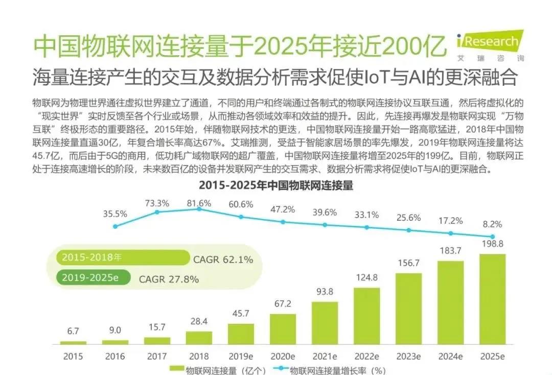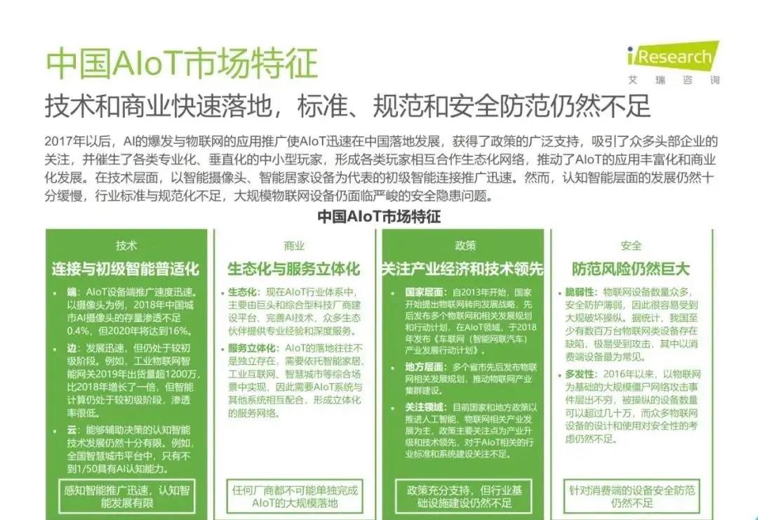 白皮書顯示,預(yù)計(jì)2025年我國物聯(lián)網(wǎng)連接數(shù)近200億個(gè),萬物喚醒、海量連接將推動各行各業(yè)走上智能道路。2019年,受益于城市端AIoT業(yè)務(wù)的規(guī)模化落地及邊緣計(jì)算的初步普及,中國AIoT市場規(guī)模突破3000億大關(guān)直指4000億量級,由于AIoT在落地過程中需要重構(gòu)傳統(tǒng)產(chǎn)業(yè)價(jià)值鏈,未來幾年發(fā)展節(jié)奏較為穩(wěn)定。當(dāng)前AIoT技術(shù)和商業(yè)快速落地,然而,認(rèn)知智能層面的發(fā)展仍然較慢,行業(yè)標(biāo)準(zhǔn)與規(guī)范化不足,大規(guī)模物聯(lián)網(wǎng)設(shè)備的安全問題也有待重視。