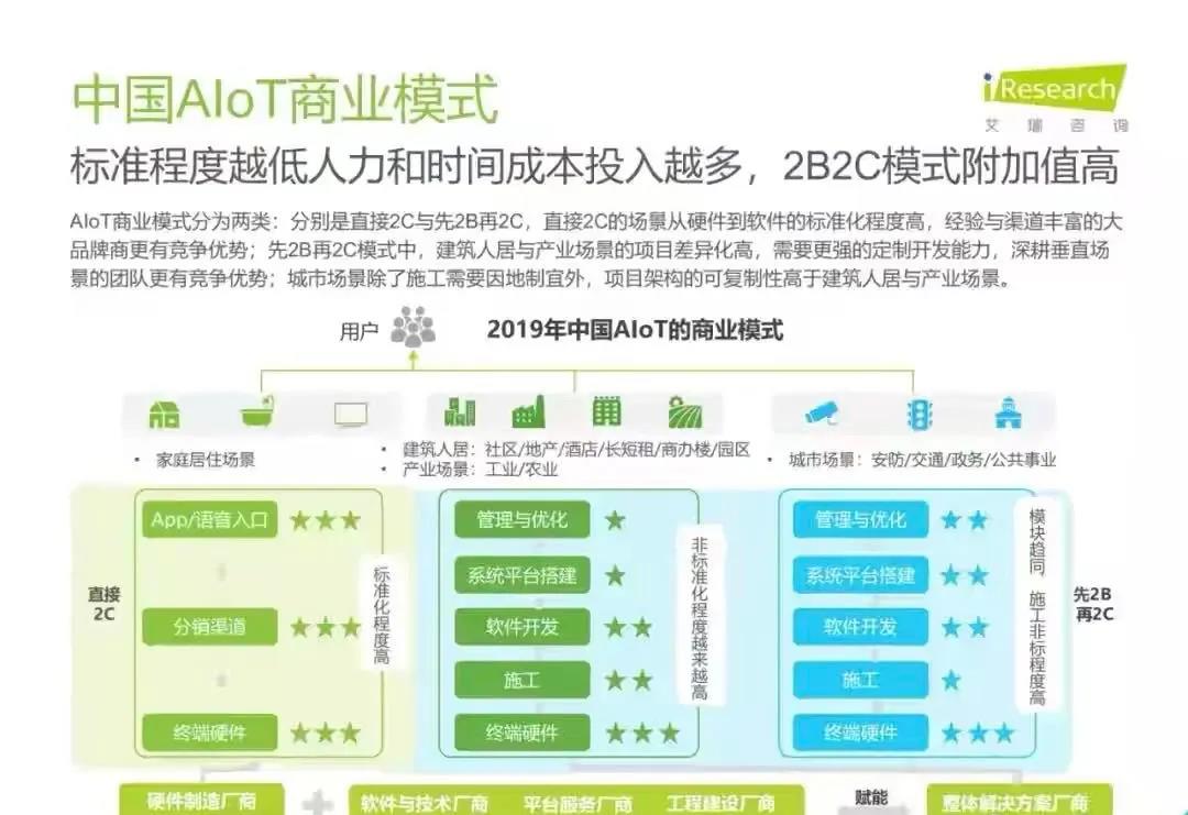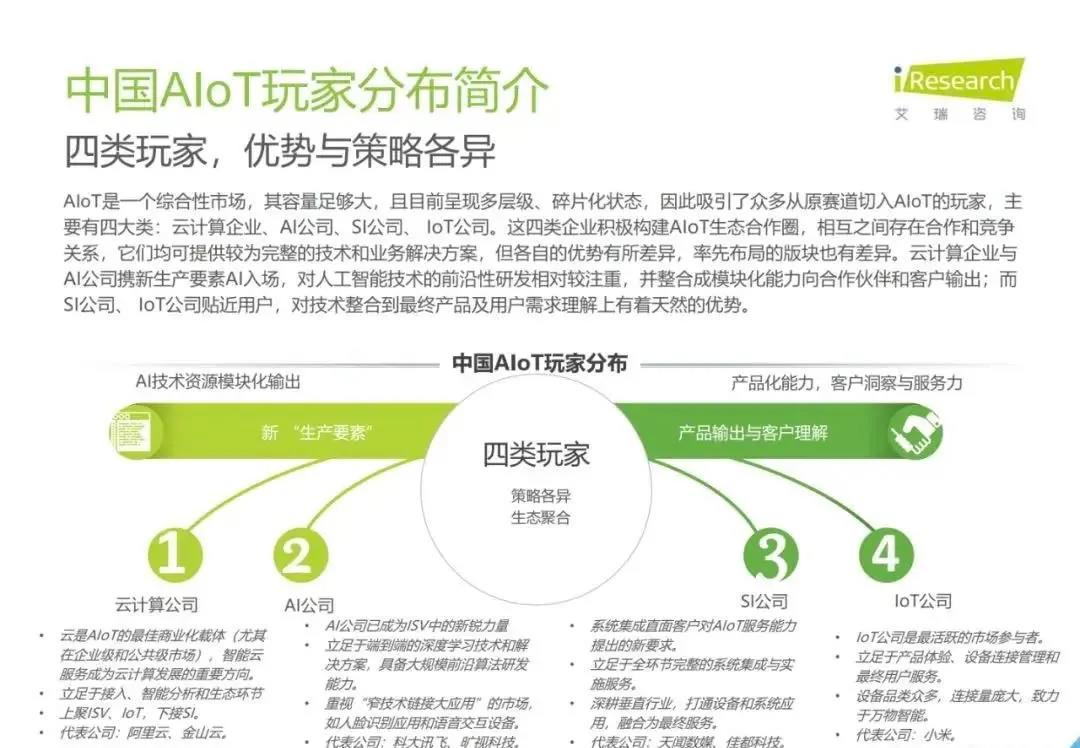 白皮書指出,AIoT是一個(gè)綜合性市場,其容量足夠大,且目前呈現(xiàn)多層級、碎片化狀態(tài),因此吸引了眾多從原賽道切入AIoT的玩家,主要有四大類:云計(jì)算企業(yè)、AI公司、SI公司、IoT公司。艾瑞推測,受益于智能家居場景的率先爆發(fā),2019年物聯(lián)網(wǎng)連接量將達(dá)45.7億,而后由于5G的商用,低功耗廣域物聯(lián)網(wǎng)的超廣覆蓋,中國物聯(lián)網(wǎng)連接量將增至2025年的199億。