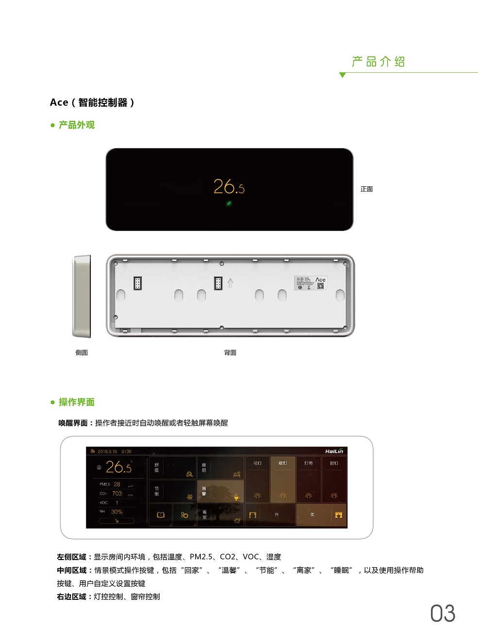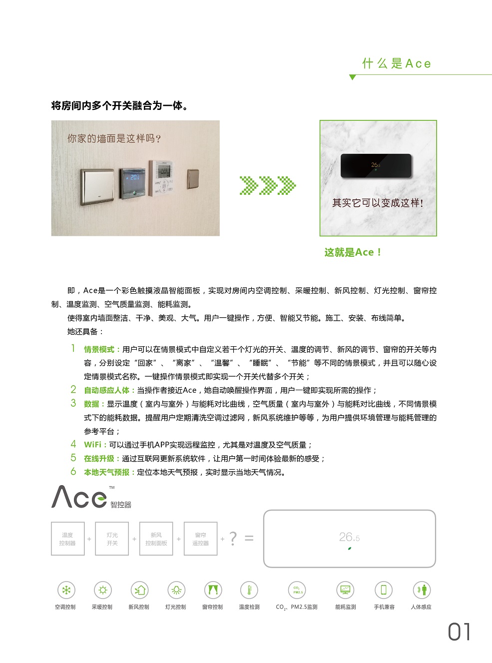 ACE將溫度控制、燈光控制、窗簾控制、新風(fēng)控制、空氣檢測(cè)集于一身,采用控制模塊集中控制,控制面板弱電連接方式,極大程度減少布線及人工成本。ACE+自學(xué)習(xí),不斷優(yōu)化用戶(hù)使用習(xí)慣,減少生活浪費(fèi),ACE就是您身邊的隱形管家。