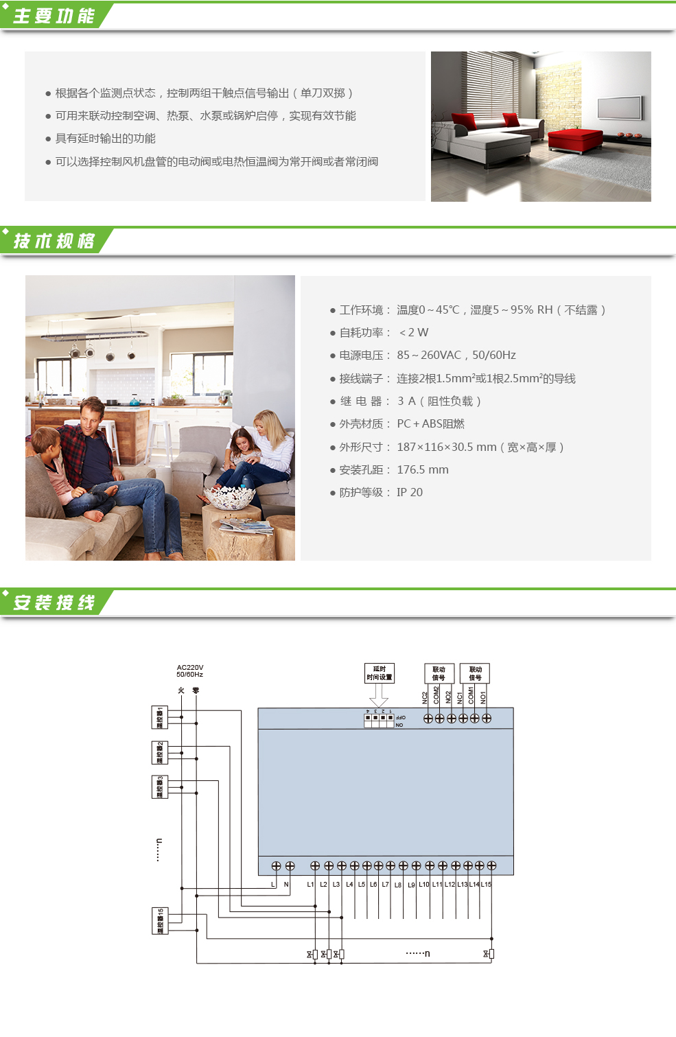 聯(lián)機(jī)控制器HL309-15,可自動(dòng)檢測各個(gè)風(fēng)機(jī)盤管或電熱恒溫閥的工作狀態(tài),根據(jù)風(fēng)機(jī)盤管或電熱恒溫閥的開關(guān),輸出干觸點(diǎn)的聯(lián)機(jī)控制信號。當(dāng)所有風(fēng)機(jī)盤管或電熱恒溫閥關(guān)閉后,輸出的干觸點(diǎn)斷開;而當(dāng)有一個(gè)或多個(gè)風(fēng)機(jī)盤管或電熱恒溫閥啟動(dòng)后,輸出的干觸點(diǎn)閉合。合理分配能源,減少能源浪費(fèi),能達(dá)到真正的“既舒適又節(jié)能”的目的。