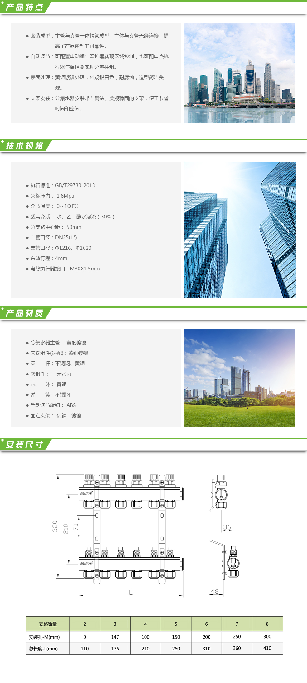 TH35系列分集水器為黃銅整體型材一體式分集水器,適用于地板采暖系統(tǒng),控制輻射地板采暖系統(tǒng)的熱能。分集水器各回路均內(nèi)置了調(diào)節(jié)水量的閥芯??杉友b電熱執(zhí)行器和溫控實(shí)現(xiàn)獨(dú)立分室度制。用戶根據(jù)需要可自行設(shè)定室溫,溫控器會(huì)自動(dòng)檢測(cè)房間溫度,并向執(zhí)行器輸出信號(hào),關(guān)閉或打開(kāi)此房間的執(zhí)行器,使室溫保持在設(shè)定溫度范圍內(nèi)。也可以在分集水器主管上加裝電動(dòng)閥,與溫控器配套使用 ...