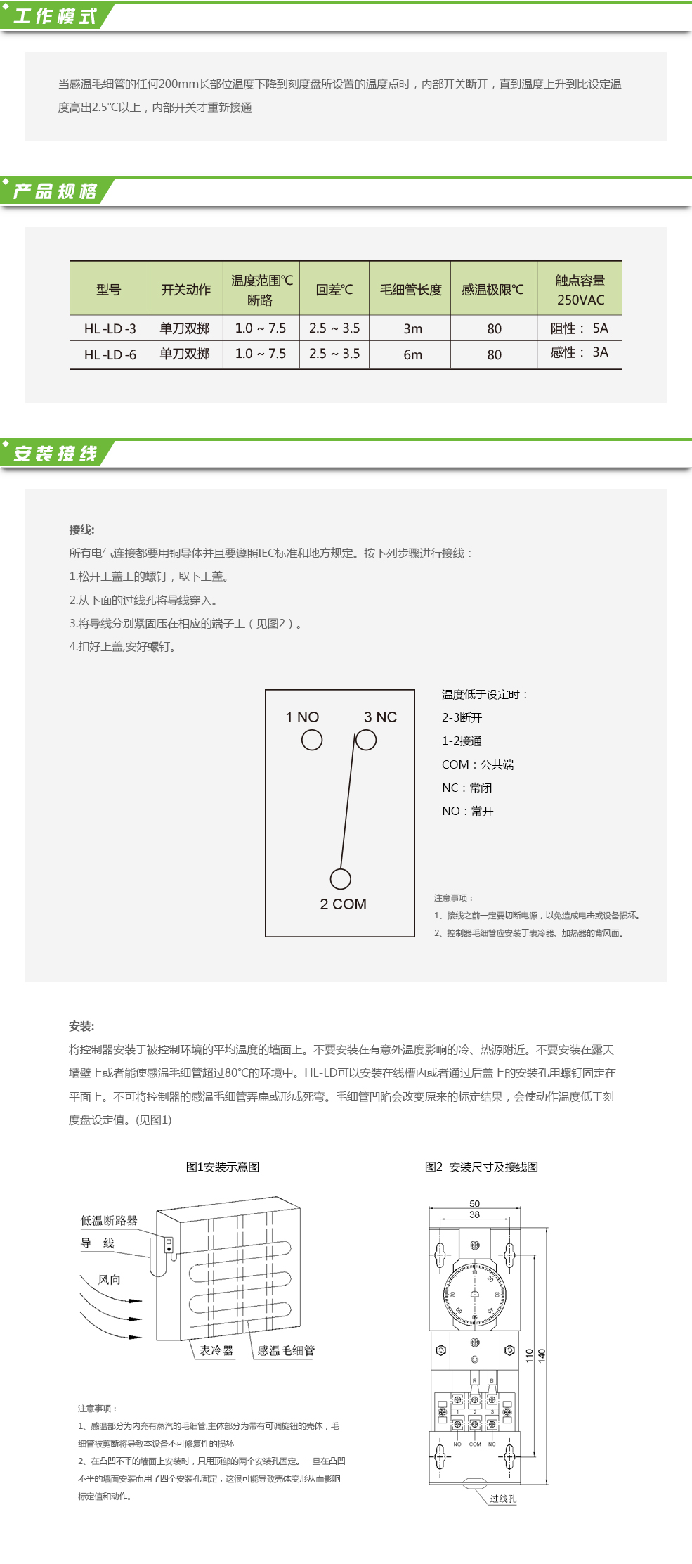 HL-LD低溫斷路控制器工作于單刀雙擲模式。典型應(yīng)用包括:低溫條件下用于保護熱交換器、表冷器以及液體工作管路為避免過冷或結(jié)冰。當(dāng)感溫毛細管的任何200mm長部位溫度下降到刻度盤所設(shè)置的溫度點時,內(nèi)部開關(guān)斷開,直到溫度上升到比設(shè)定溫度高出2.5℃以上,內(nèi)部開關(guān)才重新接通。