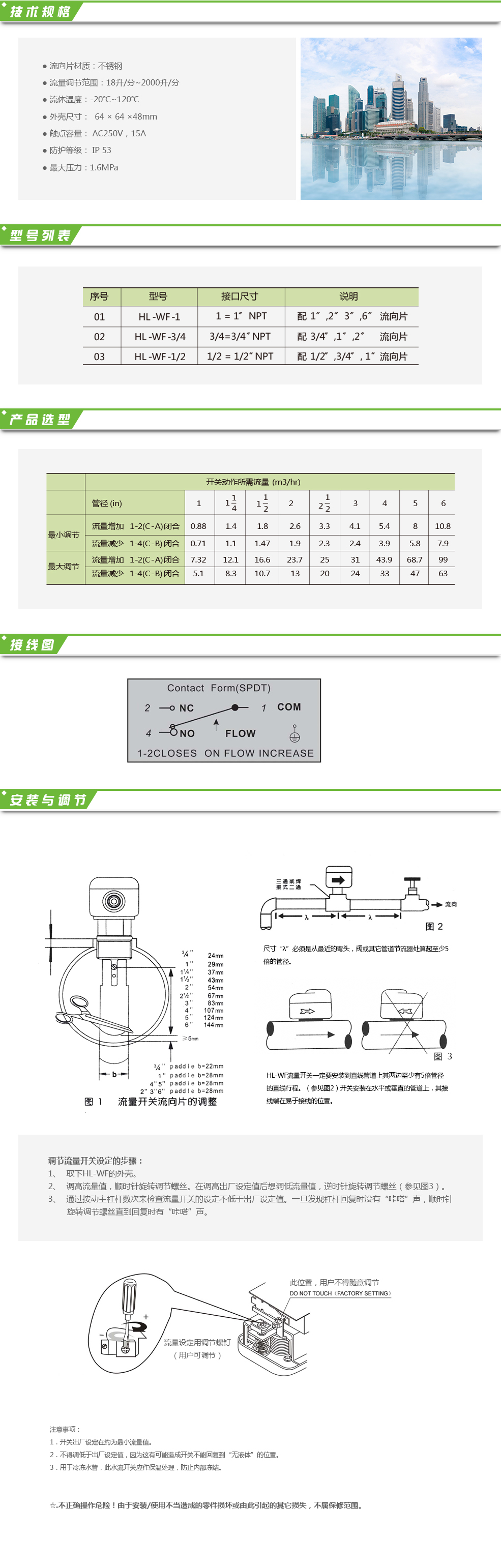 HL-WF系列液體流量開關(guān)用于測量流經(jīng)管道的液體流動狀態(tài),例如:水、乙烯、乙二醇或任何對黃銅、不銹鋼無腐蝕作用及未被定為危險液體的流體,其典型應(yīng)用是使用在需要有連鎖作用或“斷流”保護的場所。