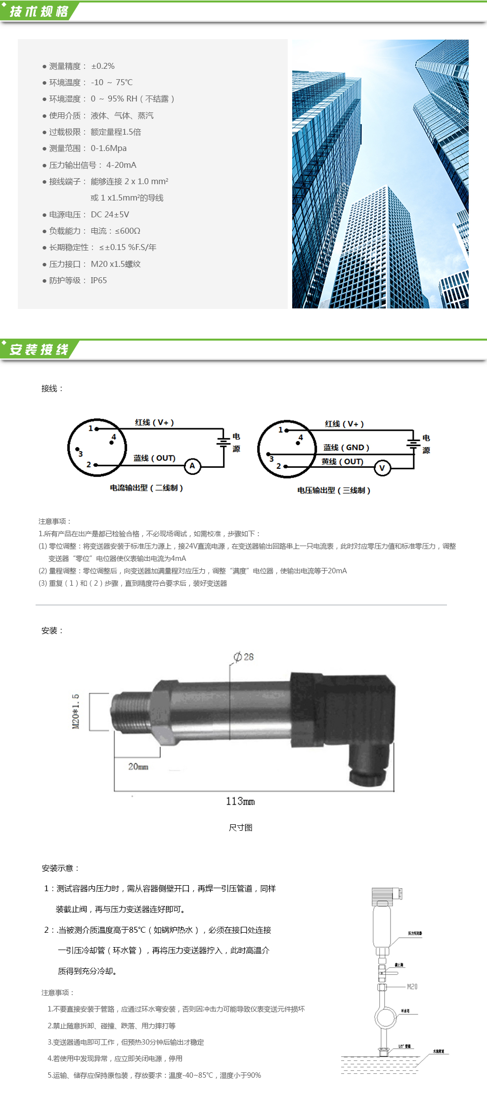 HL-PS16壓力變送器具有測(cè)量精度高,穩(wěn)定性高,體積小等優(yōu)點(diǎn),廣泛應(yīng)用于環(huán)境、醫(yī)藥、電力、食品、冶金等行業(yè),作為管道壓力控制、液位控制。變送器輸出采用兩線4-20mA,傳感器與介質(zhì)解除部分全部為不銹鋼,可直接安裝在測(cè)量管道上,使用方便。